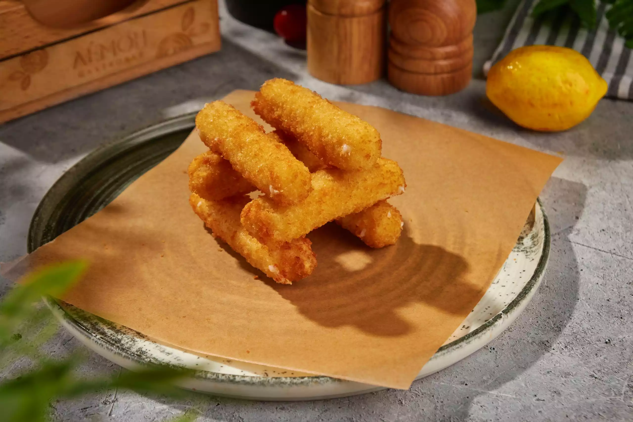 Кольца кальмаров, чесночные гренки, куриные наггетсы,сырные палочки, авторские картофельные чипсы, чесночный соус, спайси соус.