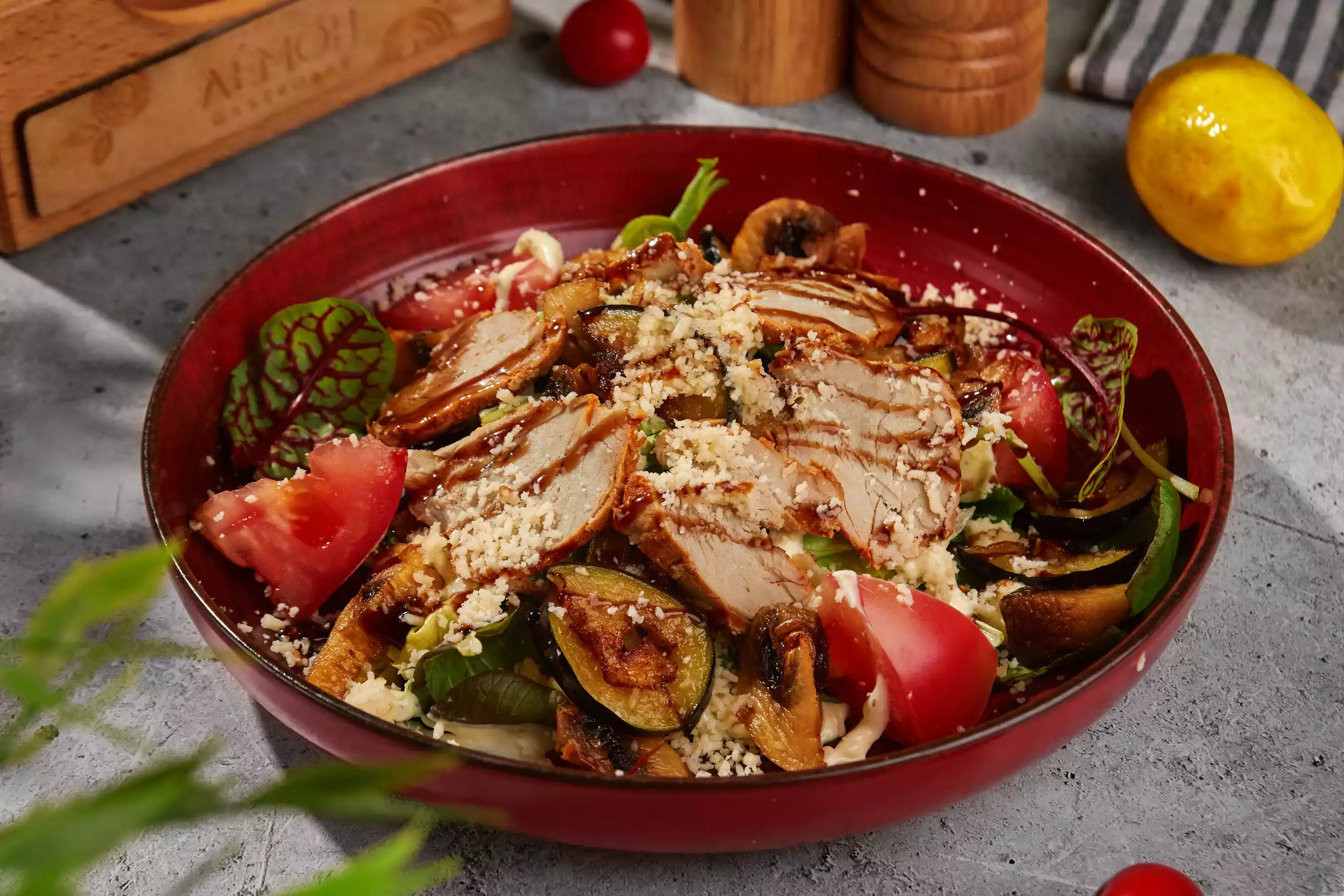 Куриное филе, микс салатных листьев, гренки, томаты черри, соус цезарь, сыр пармезан.