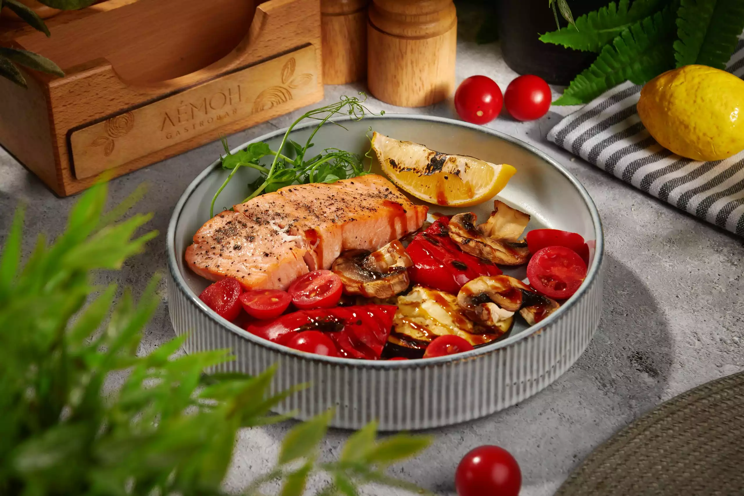 Томленая свиная вырезка, грибы, свежие овощи, крафтовые картофельные чипсы.