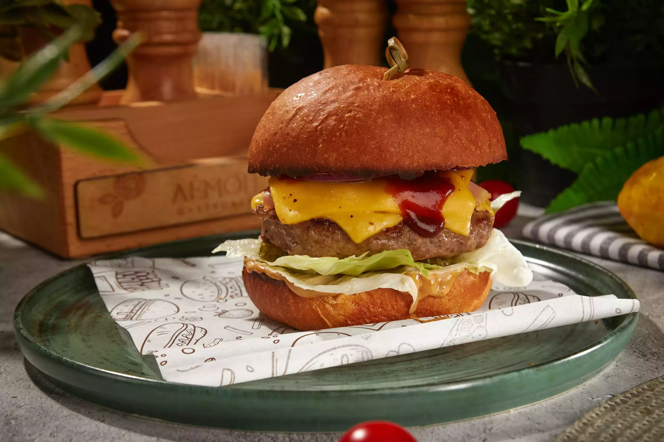 Говяжий бифштекс, бекон, томат, салат айсберг, маринованный огурец, двойной сыр, домашний соус барбекю, сырный соус.