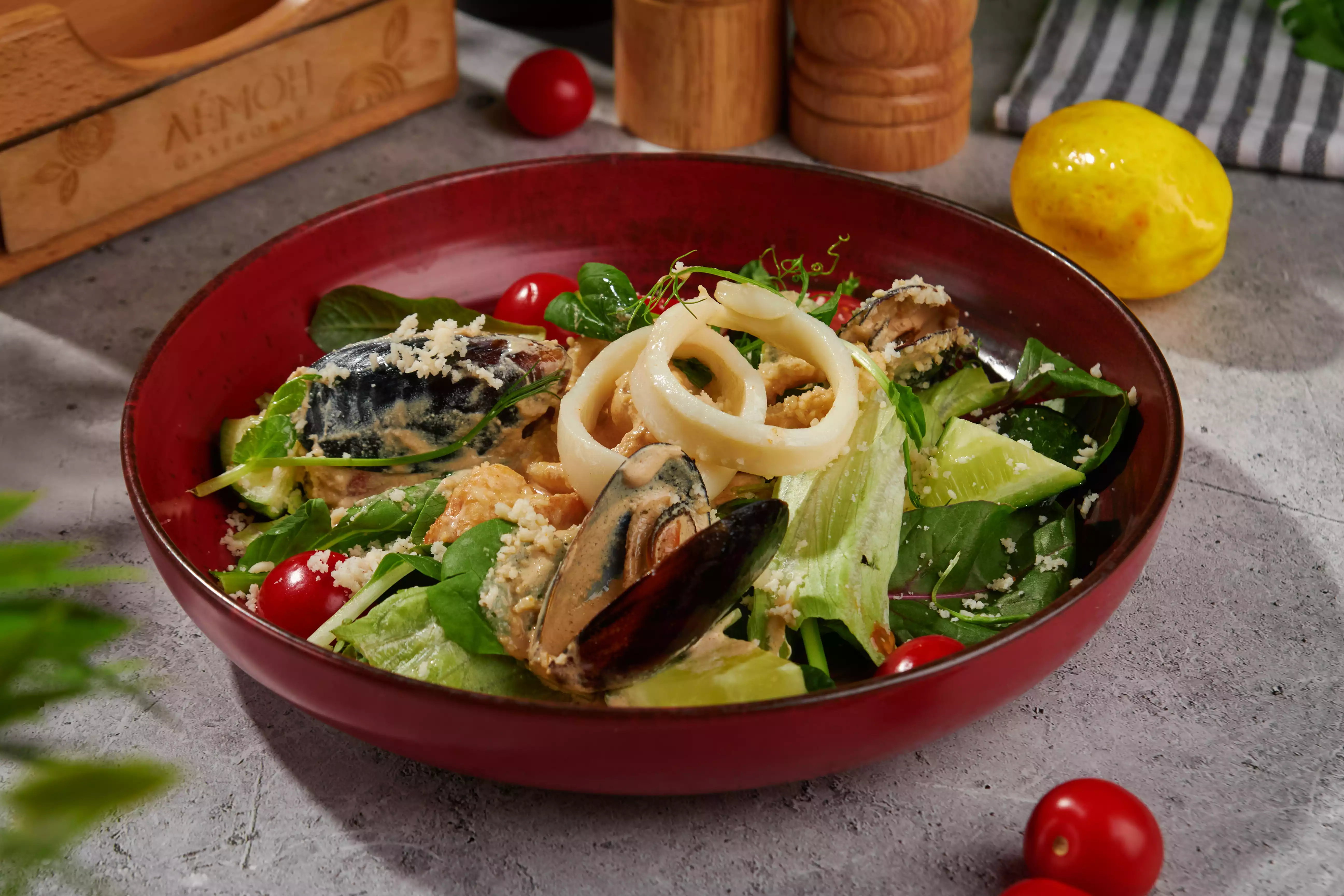 Мидии, кальмар, креветка, лосось, микс салата, свежие овощи, сыр пармезан, сливочная заправка.