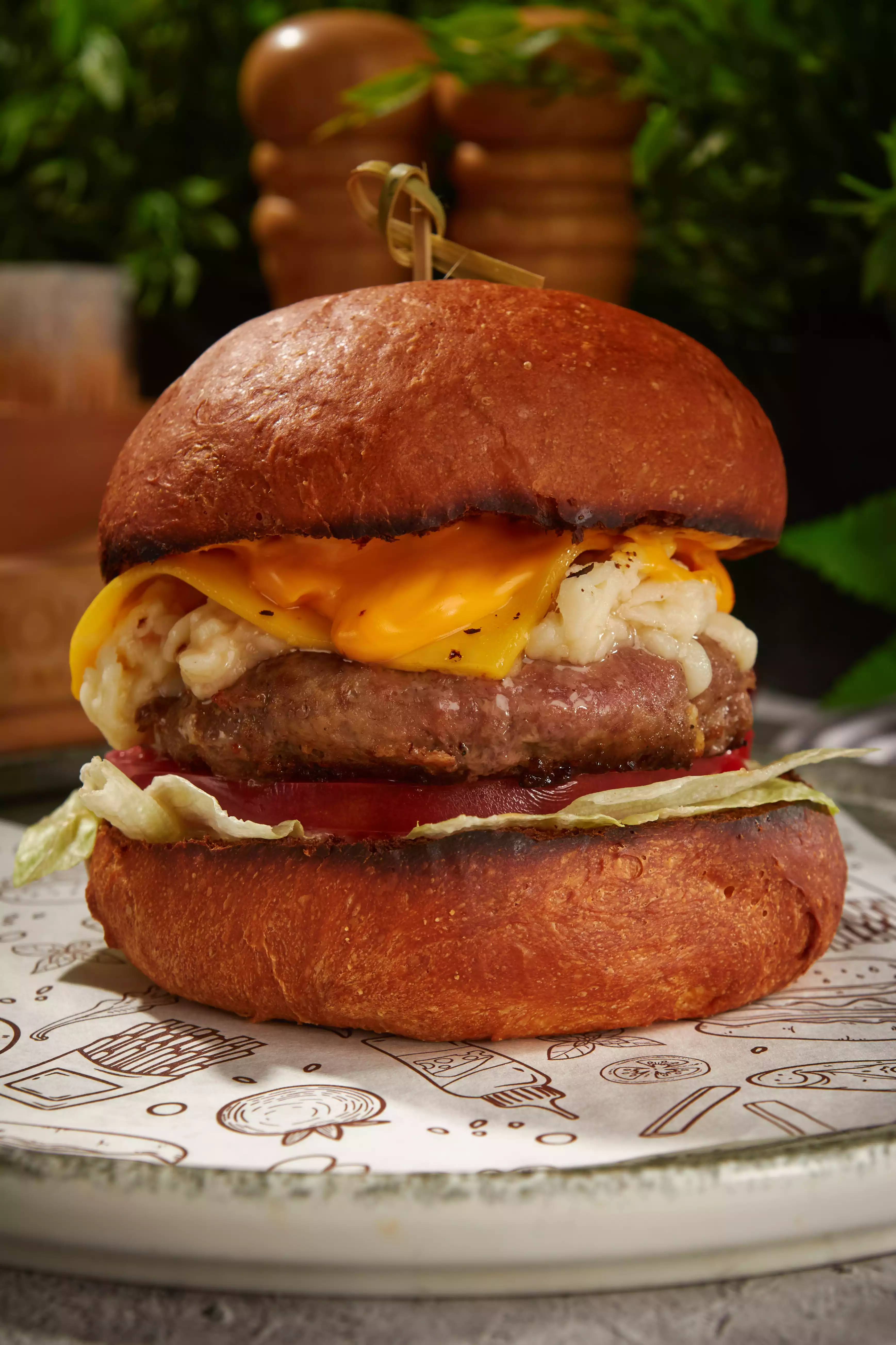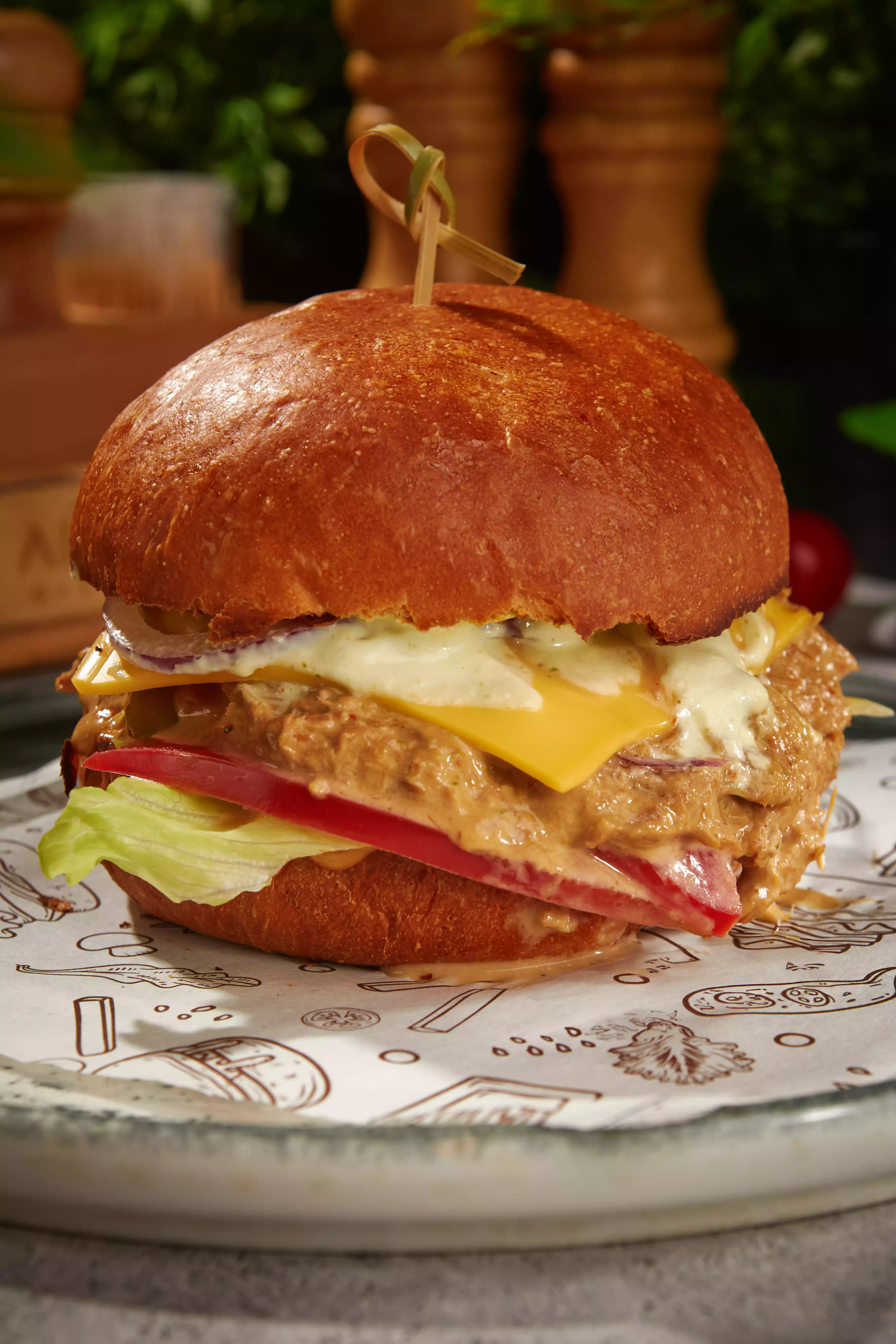 Двойной стейк из куриной грудки, фирменный пряный соус, румяный бекон, овощи гриль, двойной сыр.