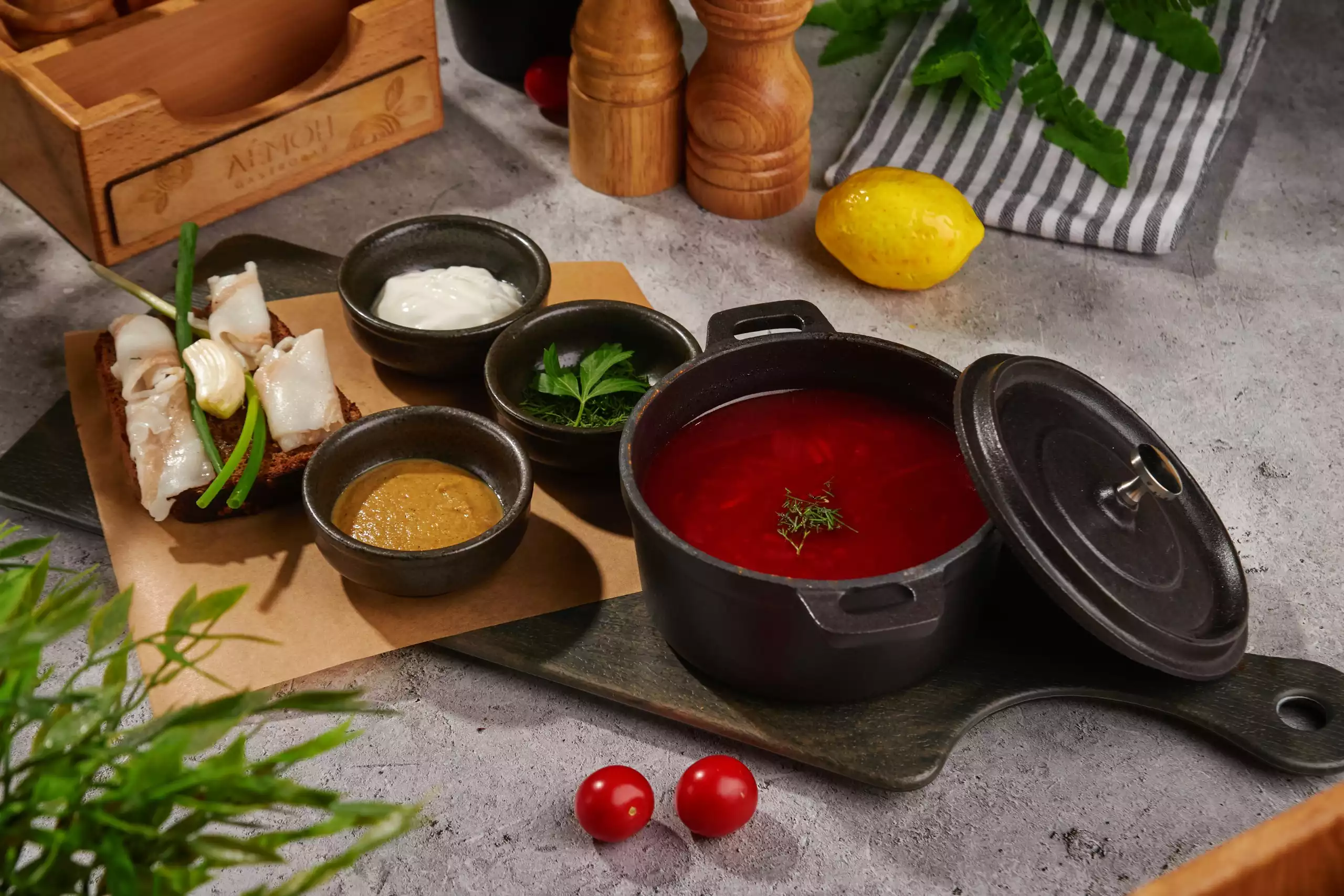 С говядиной. Подается со сметаной, тостами из бородинского хлеба, салом и домашней горчицей.