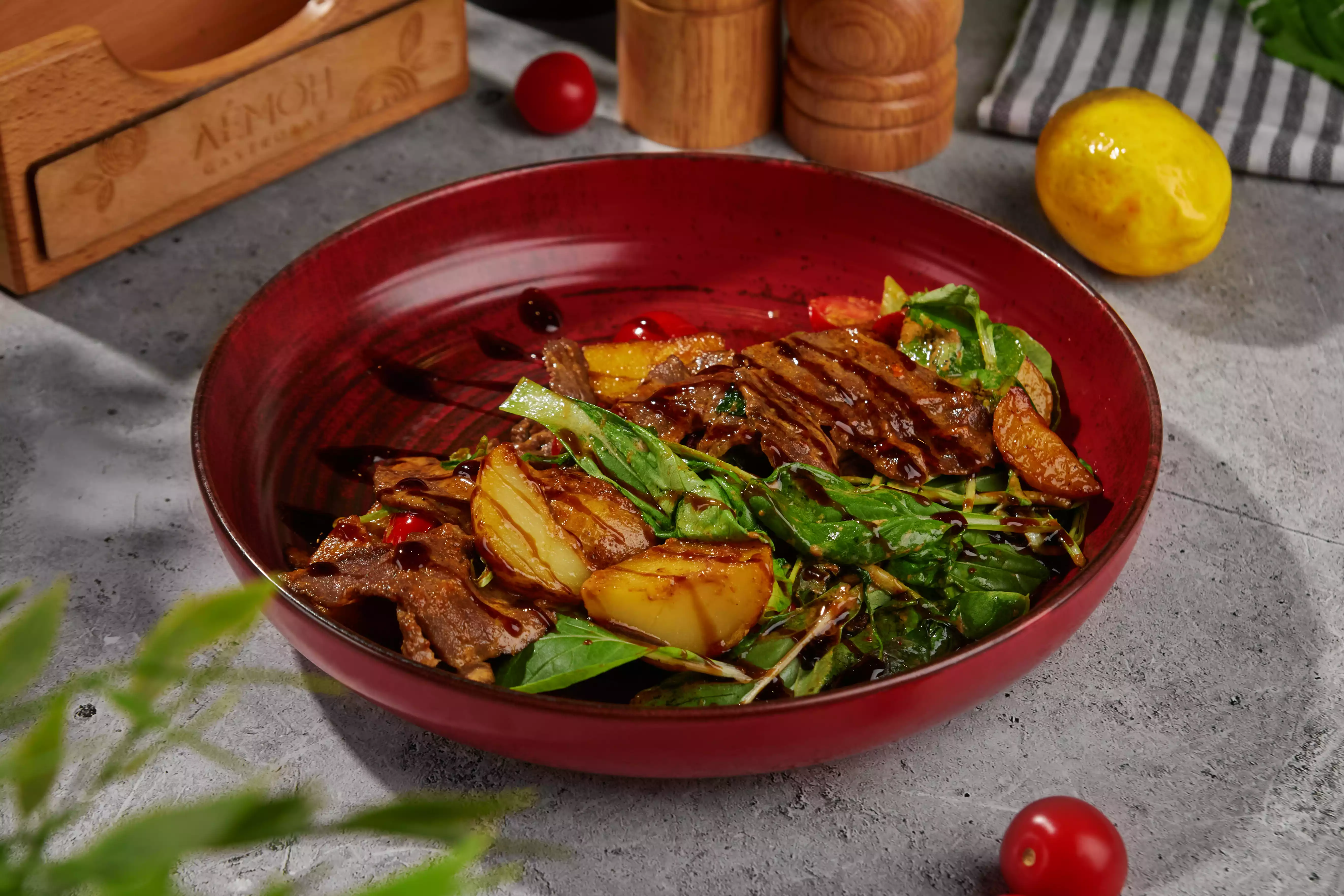 Ростбиф, молодой картофель, томаты черри, микс салатных листьев, с фирменной острой заправкой.