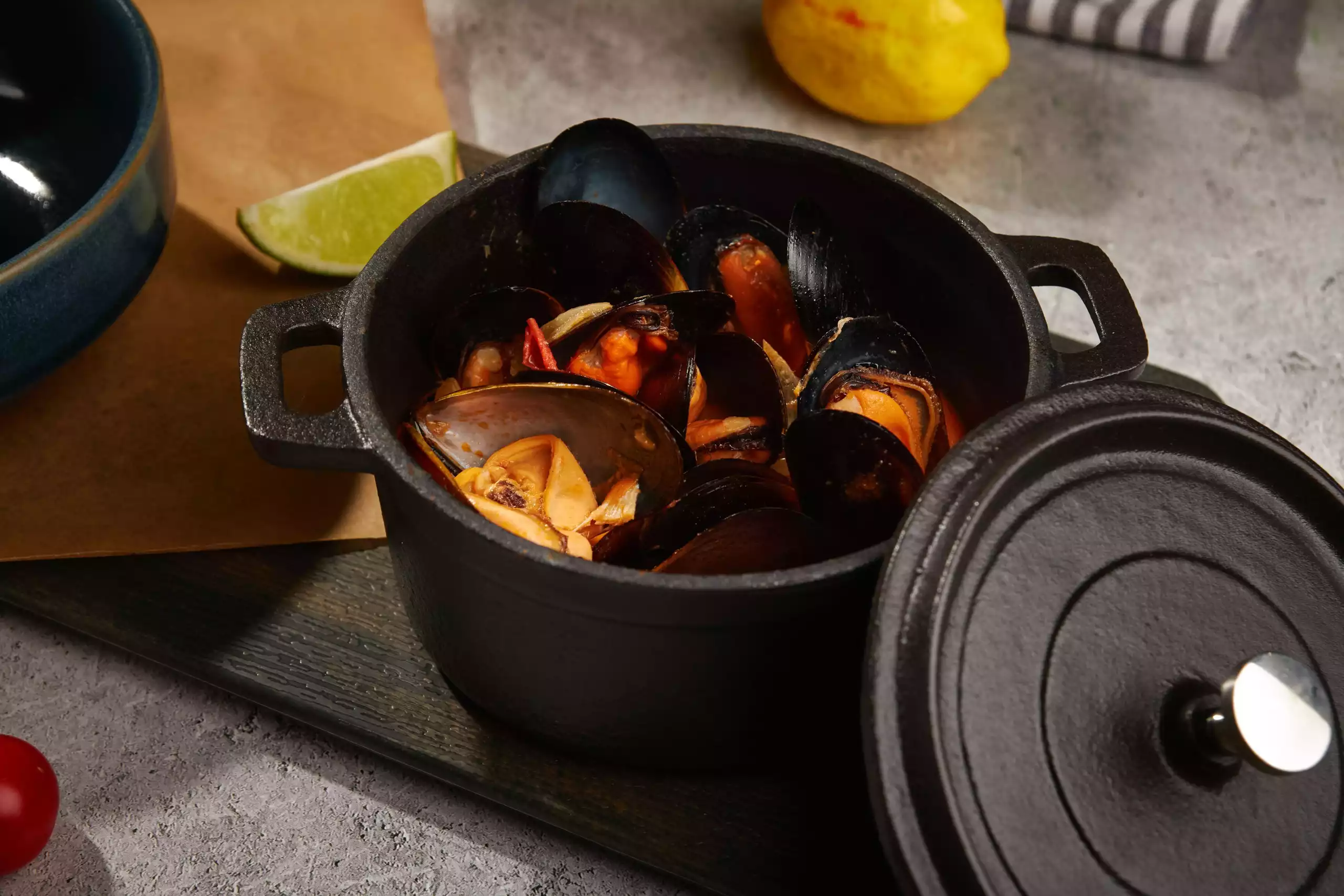 Состав: Гигинские мидии, запеченные в соусе из свежих томатов и сыра дор блю